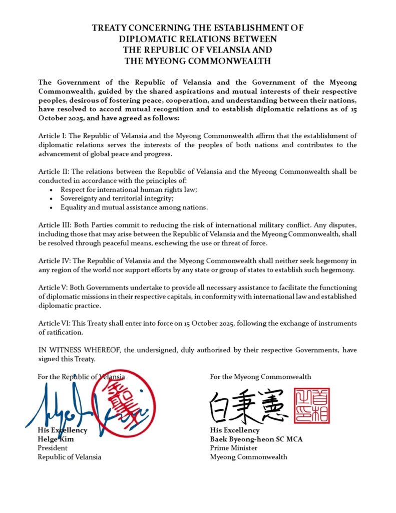 On October 11th (Sat.), the Presidency announced that it has received a notice of ratification of the Treaty Concerning the Establishment of Diplomatic Relations Between the Republic of Velansia and the Myeong Commonwealth from Prime Minister Baek Byeong-heon SC MCA’s Office.